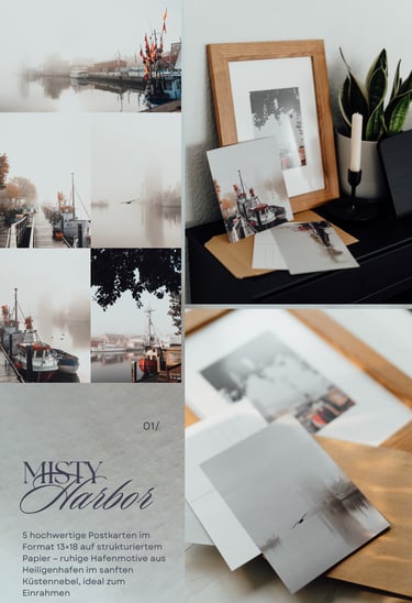 Ruhige Hafenszenen im sanften Küstennebel – minimalistisch, klar und zeitlos.