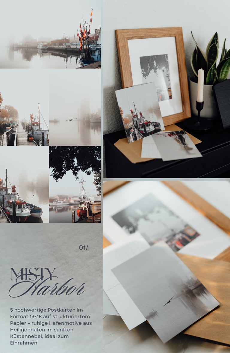 Jetzt gibt es meine Bilder zum ersten Mal auch zum Anfassen. Ich habe eine kleine Reihe von Fine-Art-Postkarten-Sets gestaltet – mit ruhigen, minimalistischen Motiven aus Heiligenhafen.